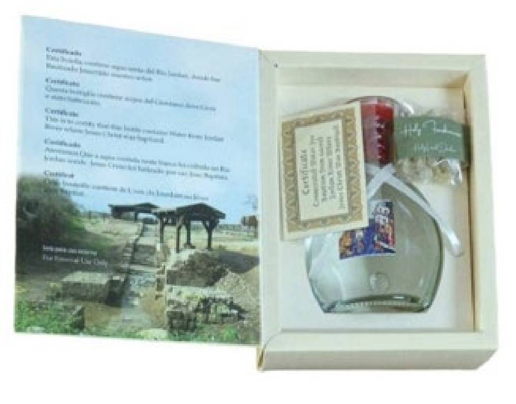 Our one of a kind gift box contains a 140 ml hand-drawn bottle filled with baptismal water from the holy site where Christ was baptized, a bag of frankincense, a rosary from the Holy Land and a brochure with pictures of the Holy baptism site.