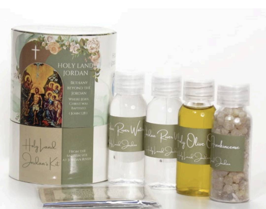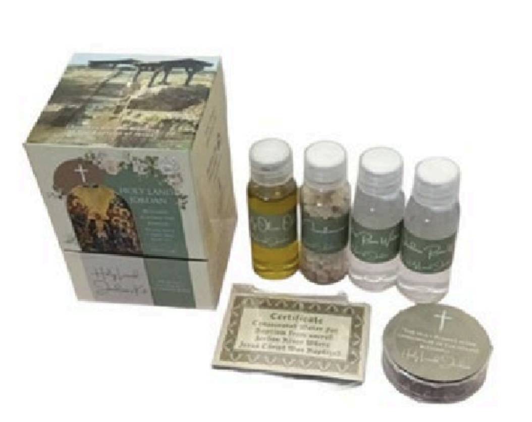 Our exceptional 4 piece package contains two 30ml baptismal water bottles, a 30ml olive oil bottle, 20ml Frankincense bottle from the Holy Land, a rosary and a brochure with pictures of the Holy baptism site.